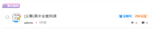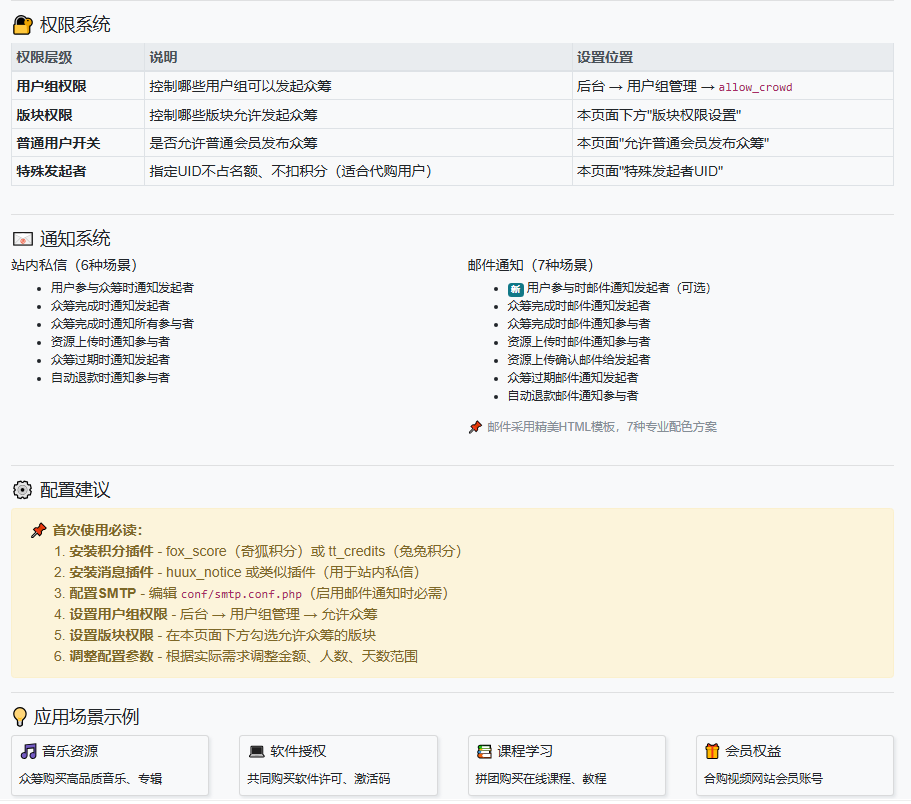 功能完善的众筹团购插件。支持多人分摊费用购买资源,双积分系统(元宝/金币),自动过期检测,自动退款,权限控制(用户组/版块/特殊发起者),完整通知系统(站内私信+邮件通知7种精美模板),实时进度展示,数据安全可靠。适用于音乐、软件、课程、会员等资源众筹场景。需预装积分插件和消息插件。