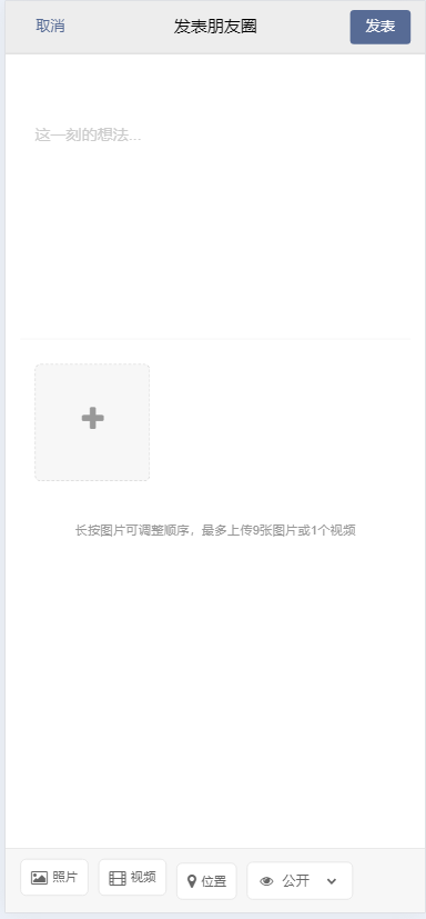 独立发布页面、九宫格图片(最多9张)、视频上传、拖拽排序、评论回复、点赞互动、可见性控制(公开/仅好友/私密)、好友动态过滤、自定义封面、位置打卡