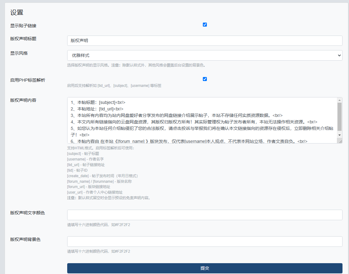 帖子内显示版权声明,支持PHP标签解析、多种显示风格