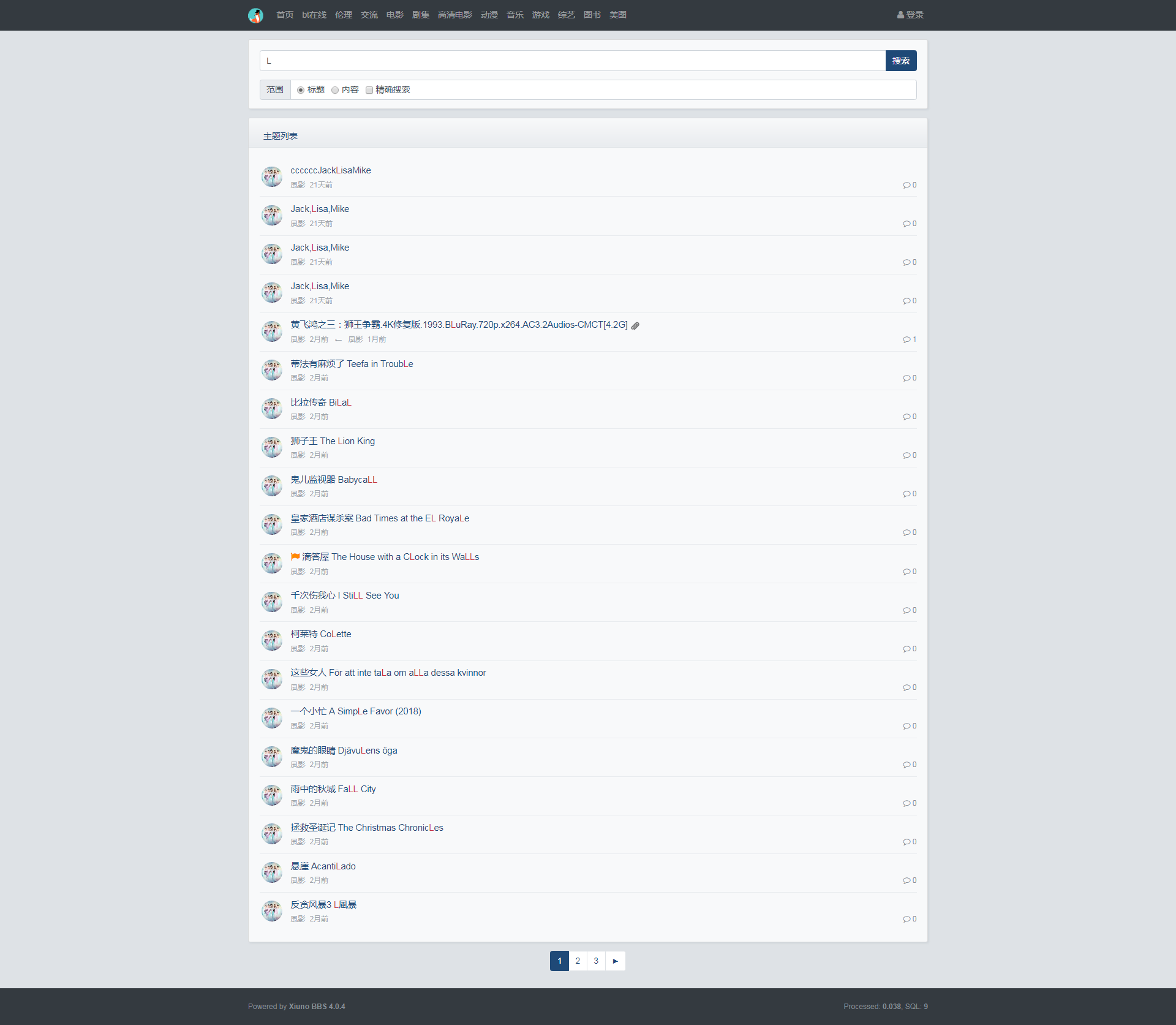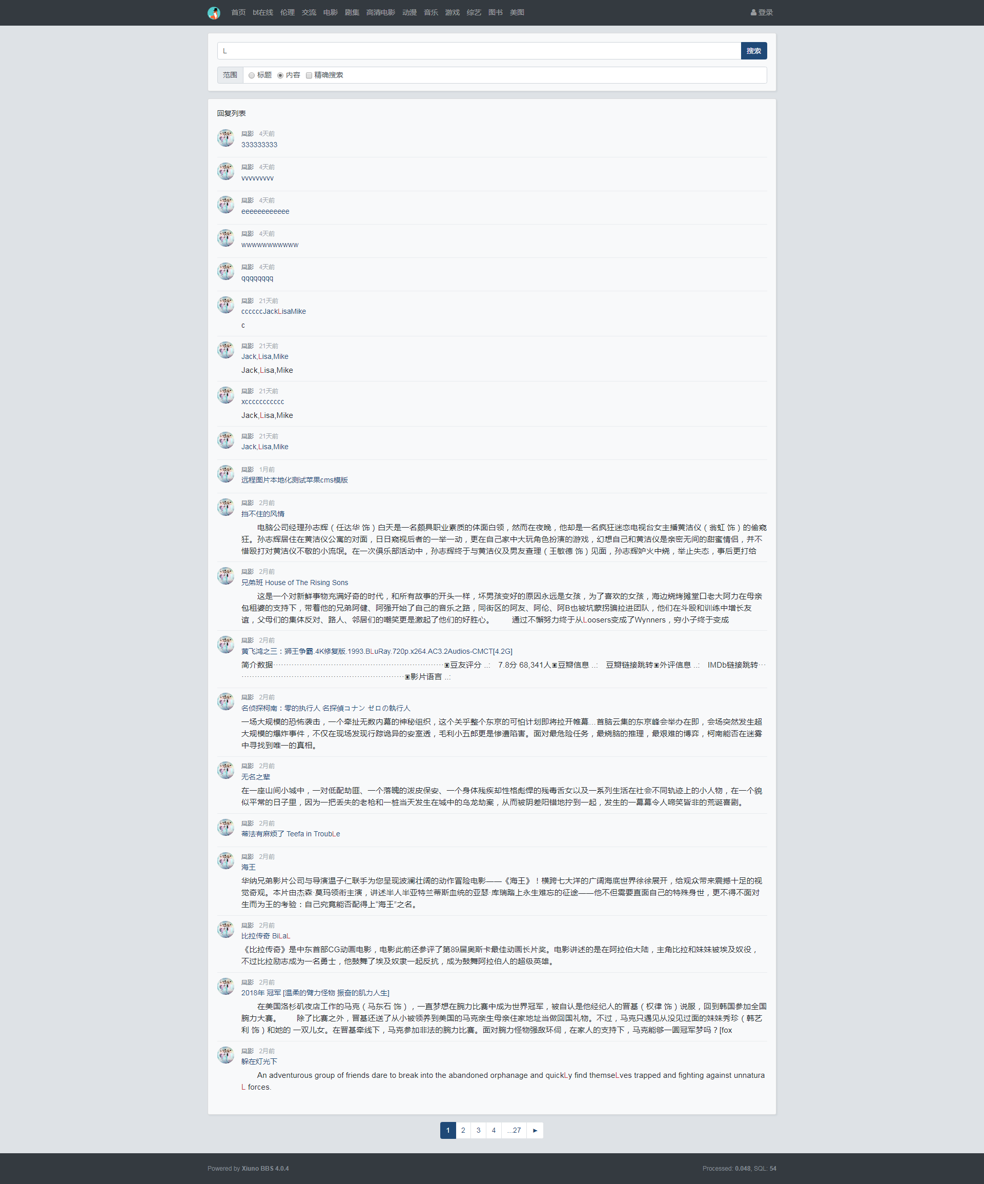 在XIUNOBBS官方搜索插件基础上强化了LIKE搜索,支持模糊搜索以及精确搜索,并且分页显示;开启、关闭搜索框以适用于自带搜索框的模版。
