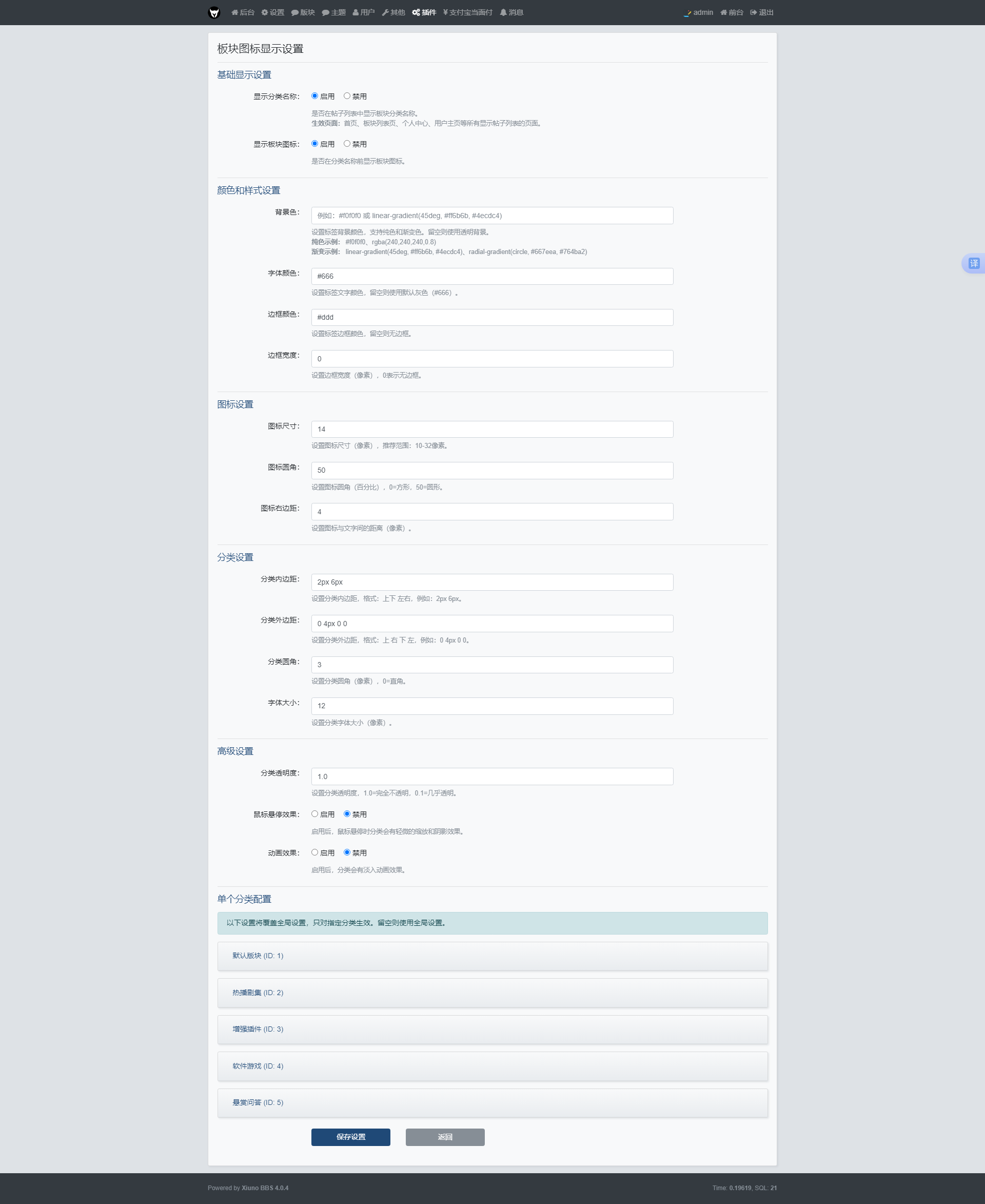 功能包括:板块图标显示、分类名称开关、自定义背景色(支持渐变)、字体颜色设置、图标尺寸调整等。